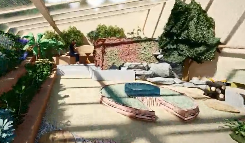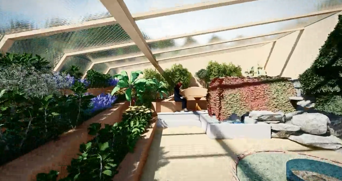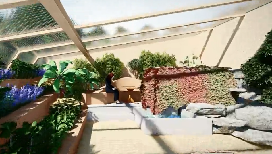 The recreation space in the Aquapini is located at the heart of the structure and serves as a shared area within the productive greenhouse environment. It features green pockets and planting zones that extend into the space, allowing visitors to experience the growing systems up close. Wooden seating is provided for rest and observation, offering a clear view of the surrounding terraces and aquaponic areas. This central zone functions as a calm gathering spot where people can relax, learn, and engage with the sustainable systems around them.