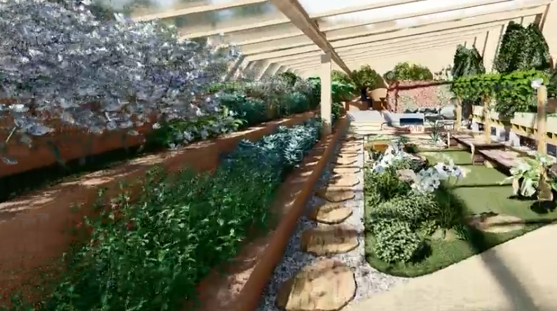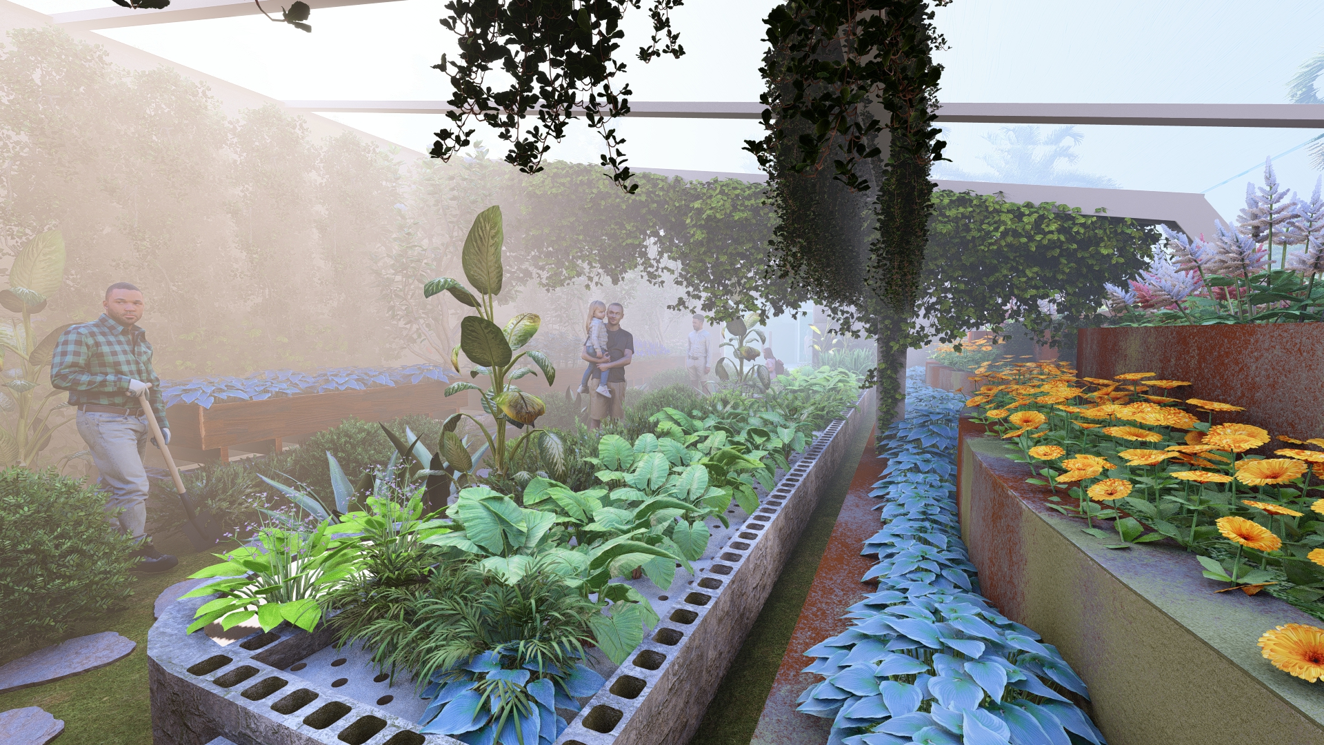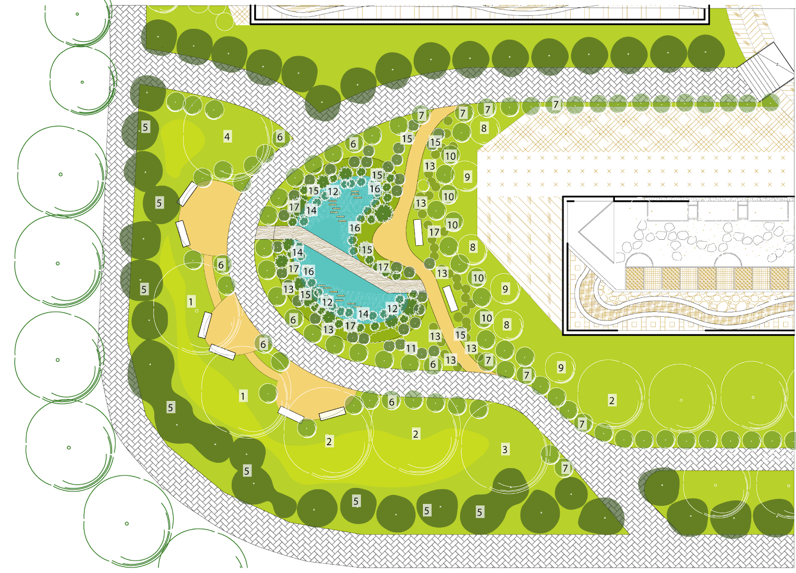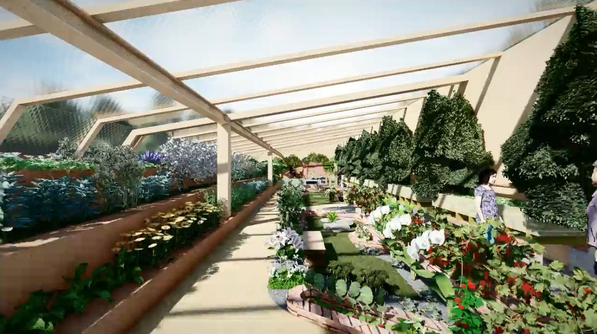 The seasonal and flower areas will be placed in the center of the site to create a visual focal point, drawing people in as soon as they enter the space. A retention pond area will also be reserved to facilitate rainwater collection and management.