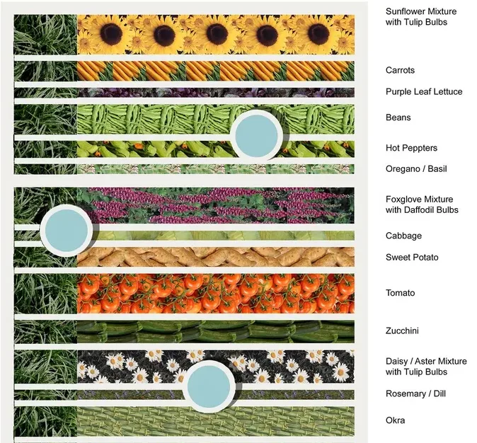 The plant palette and landscape design emphasize a harmonious blend of aesthetics, functionality, and ecological value. Layers of planting in a food forest create a multi-tiered ecosystem that maximizes productivity and biodiversity. Plant selection focuses on species that provide food and medicinal benefits, enhancing community utility. Additionally, the design prioritizes ecological functions, supporting pollinators, improving soil health, and fostering a resilient and sustainable environment.