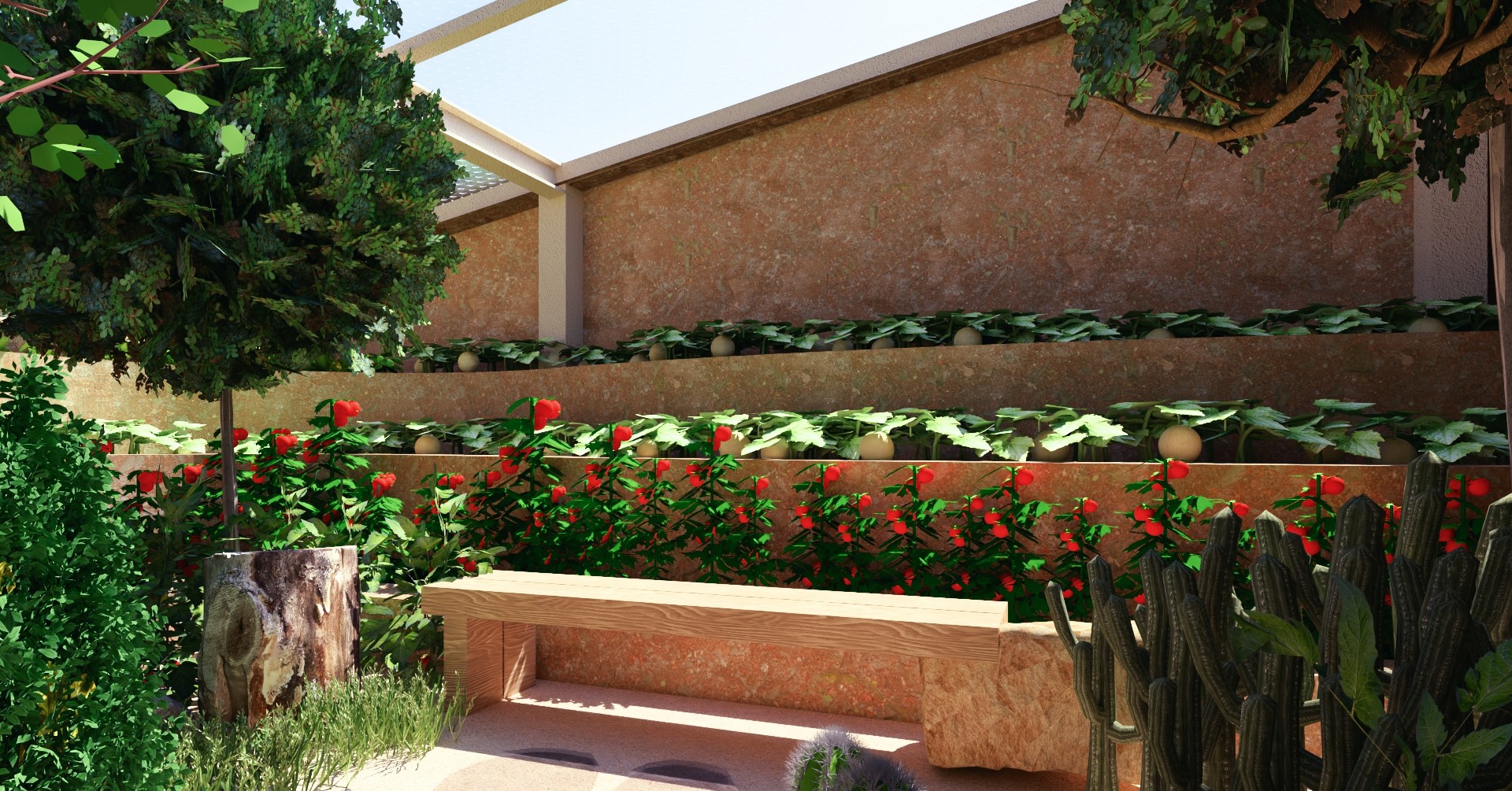 At the end of the greenhouse structure, a wooden seating area provides a comfortable resting spot for visitors. Raised a few steps high, it offers a complete view of the greenhouse, including the terrace planting and aquaculture features. From this vantage point, people can relax, observe the surrounding greenery, and enjoy the lively aquaculture system, making it a space for both rest and connection with nature.