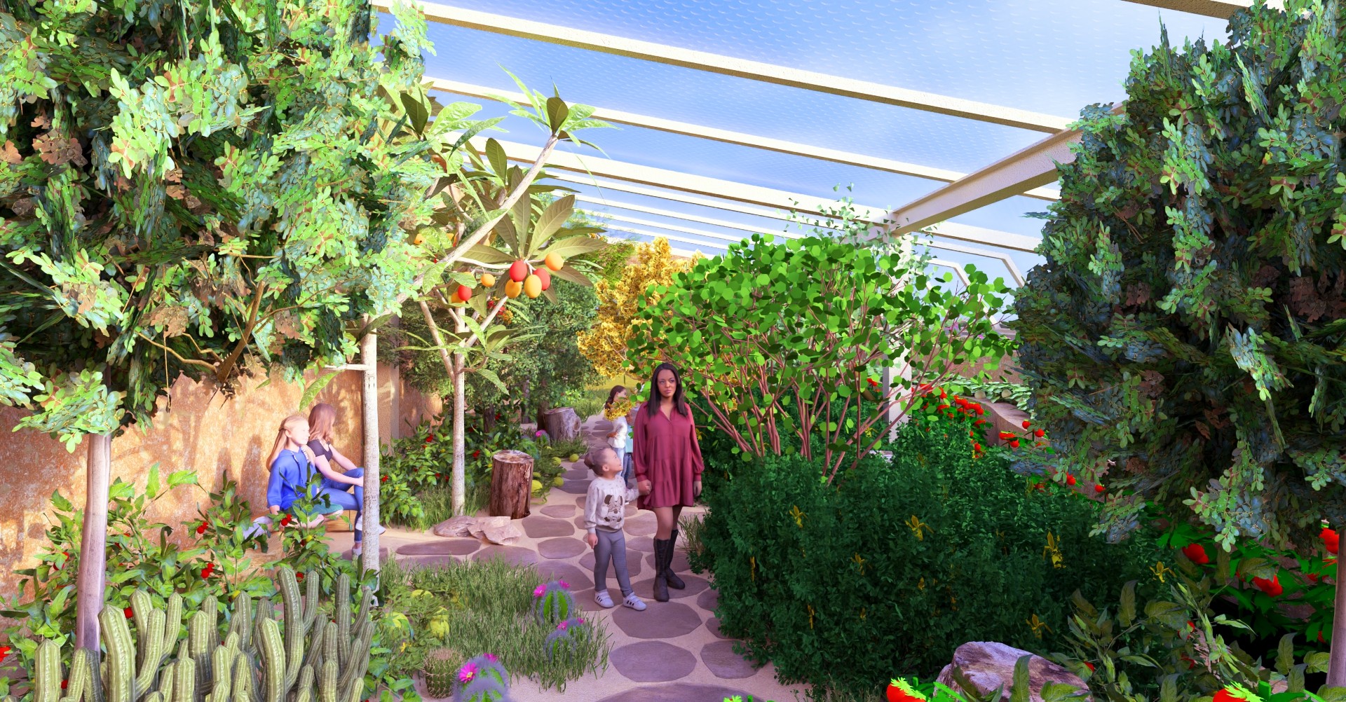 The goal of the fruit tree area is to create an engaging space focused on edible value. By grouping together a variety of fruit trees, this area will provide a diverse and interesting experience, allowing visitors to explore different types of fruits throughout the year. The combination of various fruit-bearing trees will offer both a practical harvest and an enjoyable, educational experience, enhancing the interaction with nature.