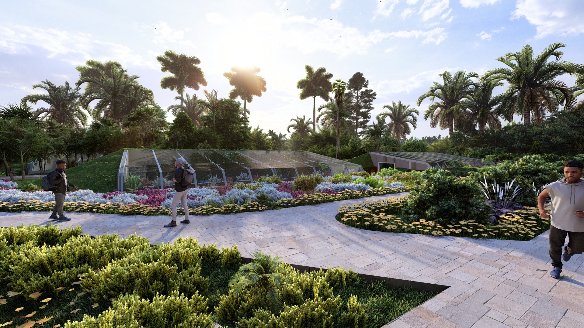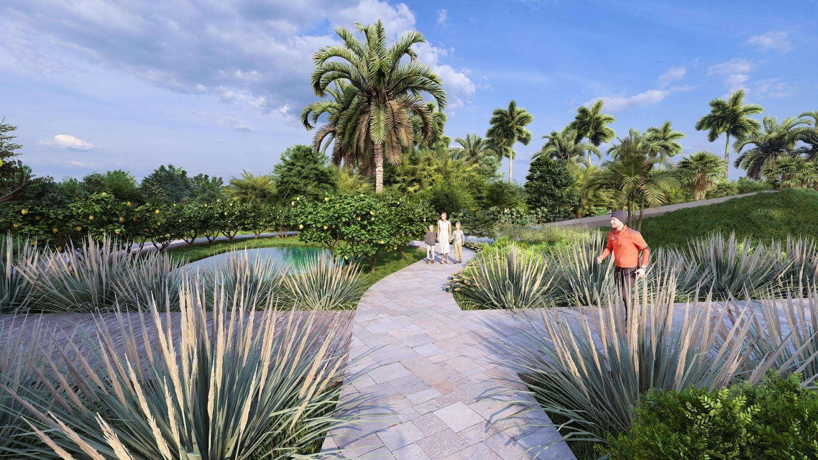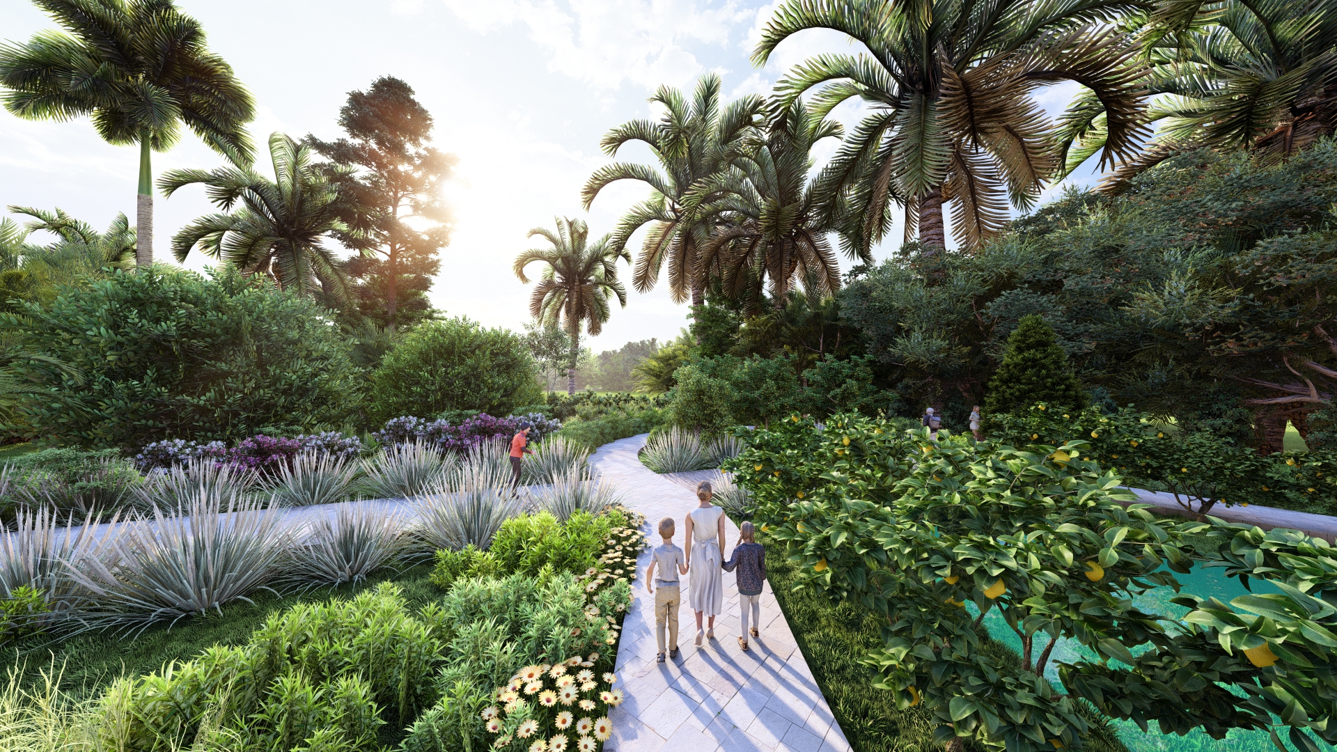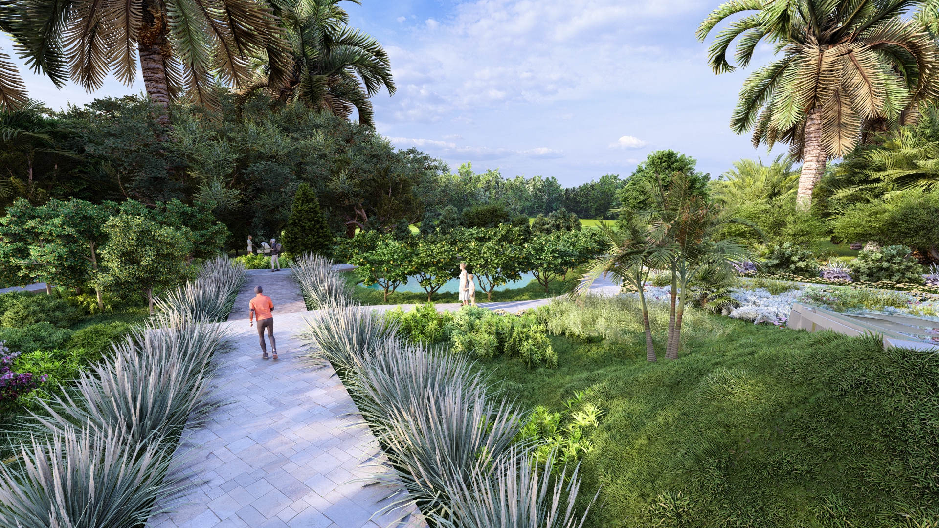 Garden pathway linking plazas, lawns, and seating areas, inviting exploration and social interaction – Click to Enlarge