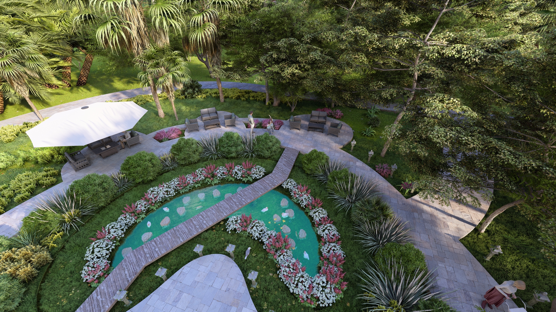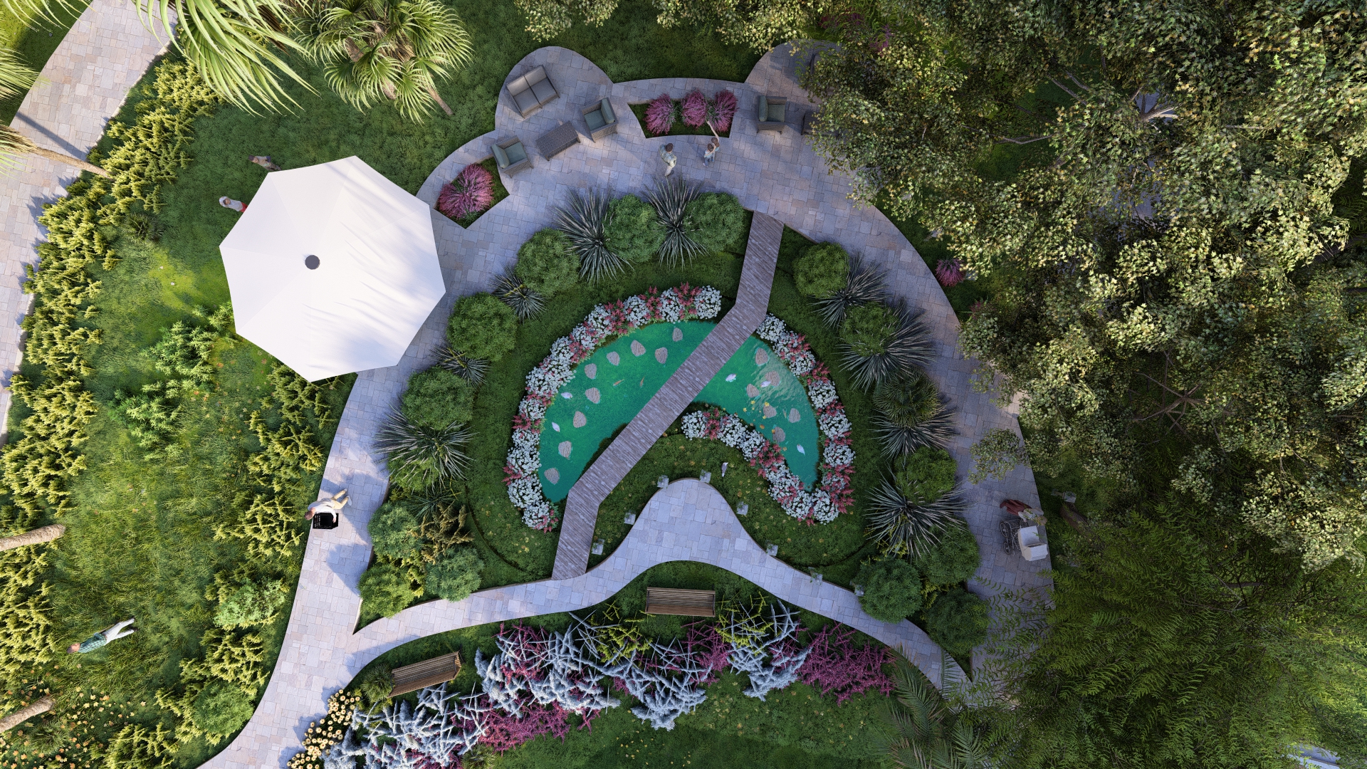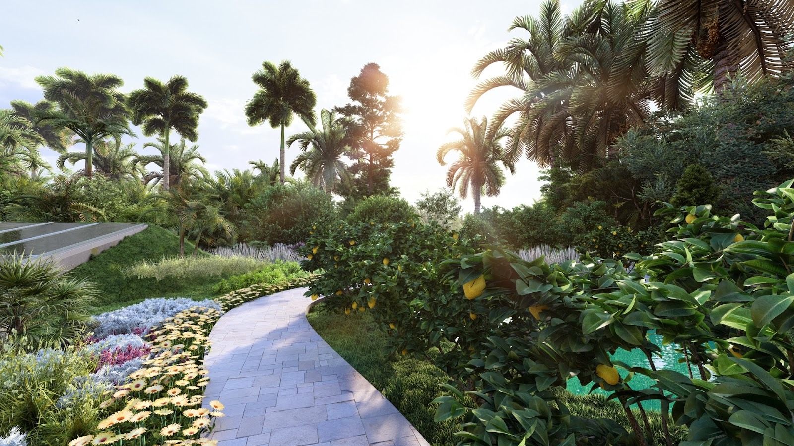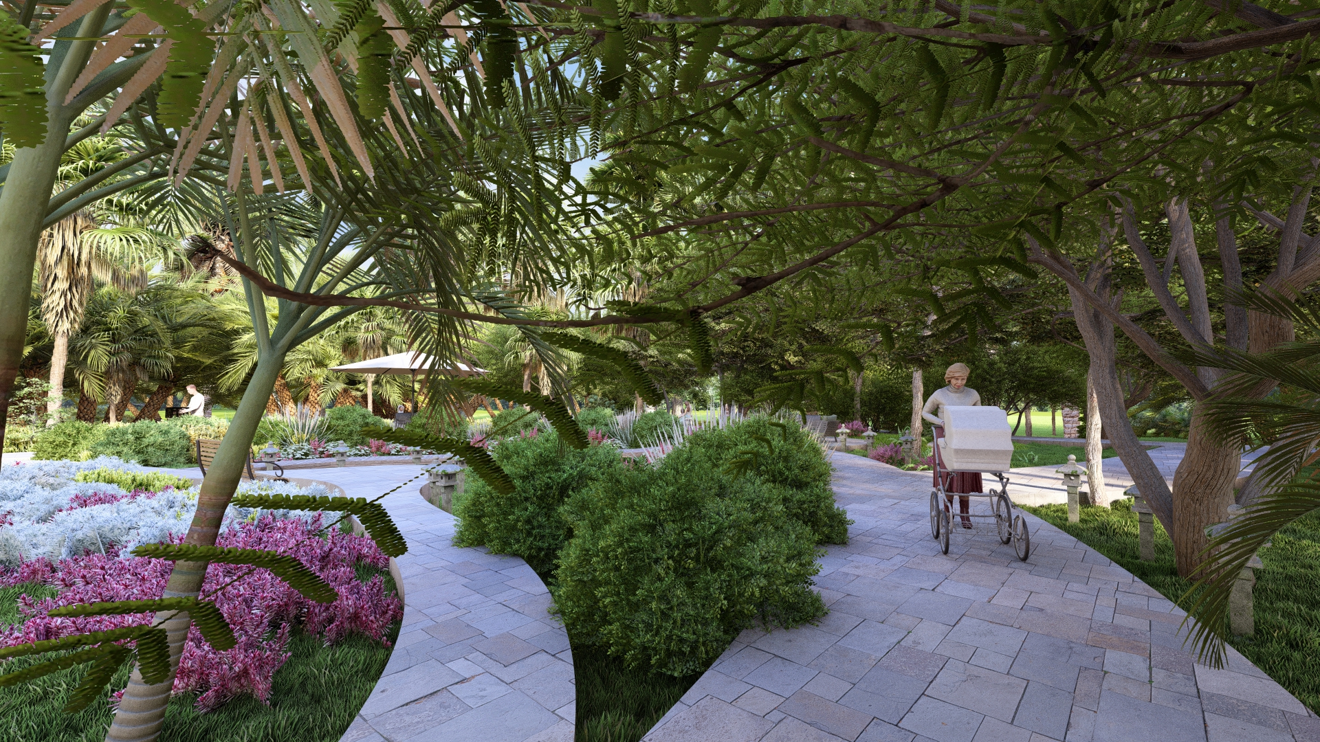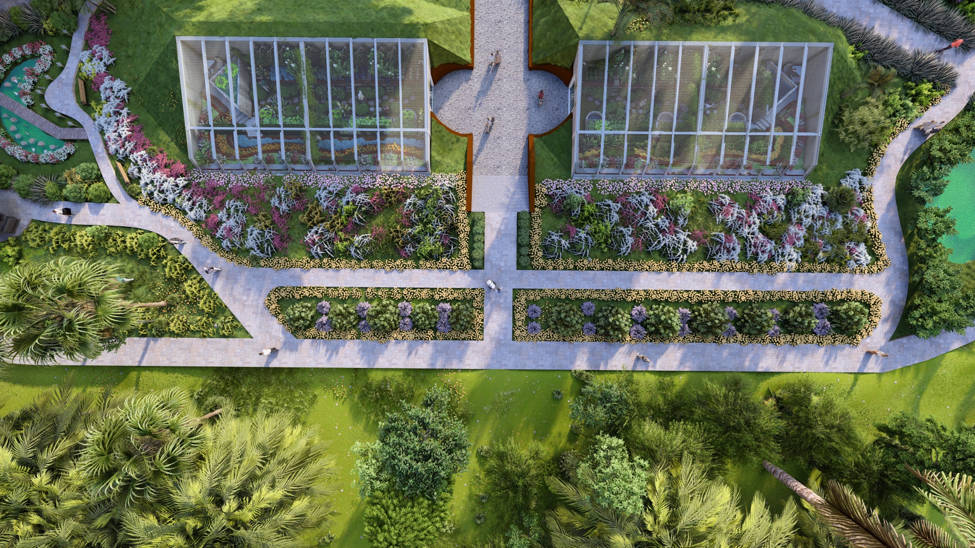 Garden pathway linking plazas, lawns, and seating areas, inviting exploration and social interaction – Click to Enlarge