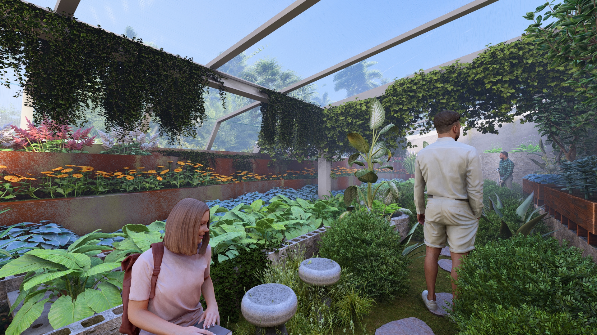 These benches offer visitors a place to unwind amidst terraces, lush greenery, and aquaponics – Click to Enlarge