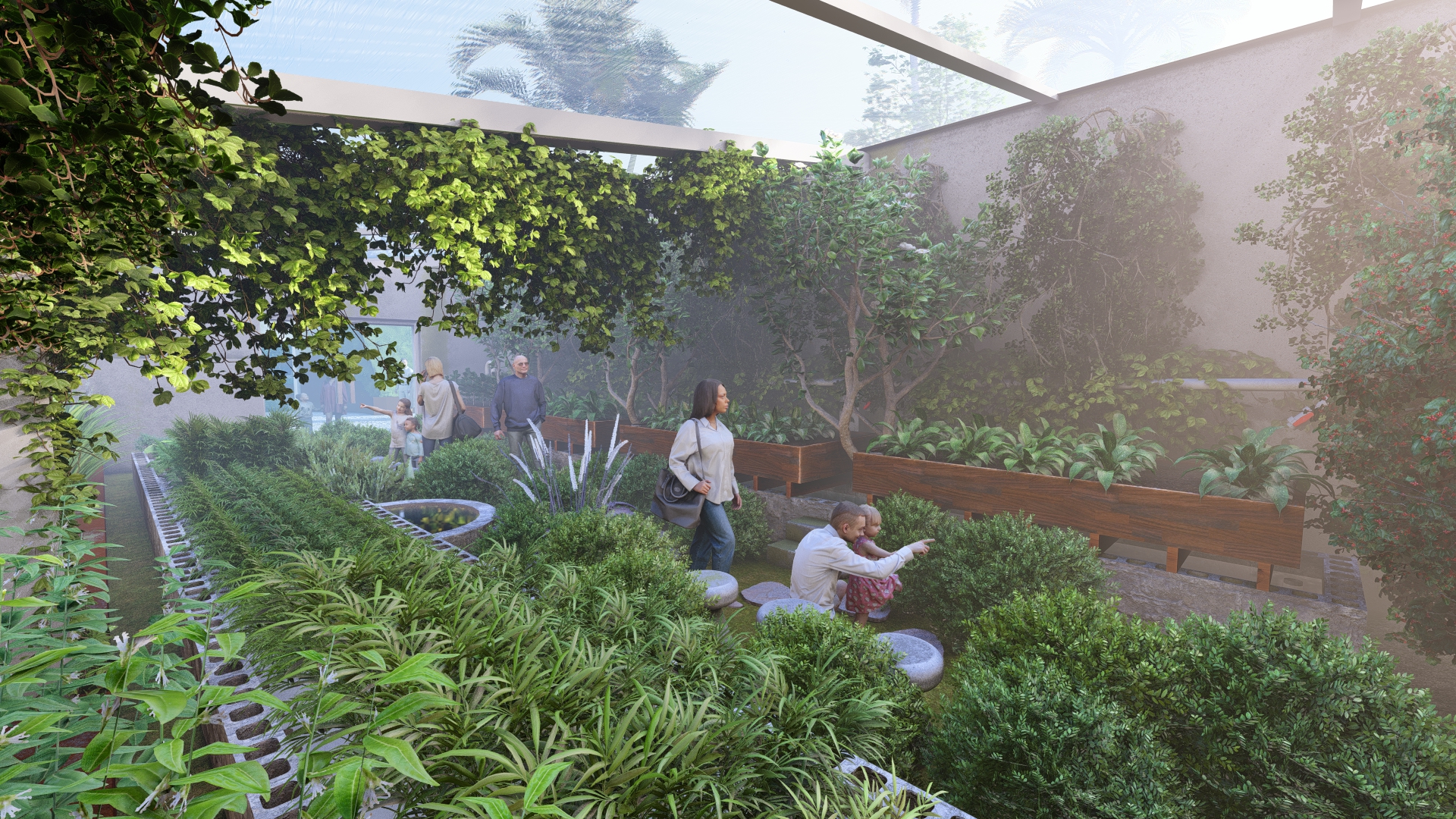 The central seating area is flanked by terrace planting and aquaponics, with pathways on both sides. It has green grass and wooden benches for people to sit and relax. Surrounding plants create a calm, natural environment where visitors can enjoy the greenery and the life of Aquapini.
