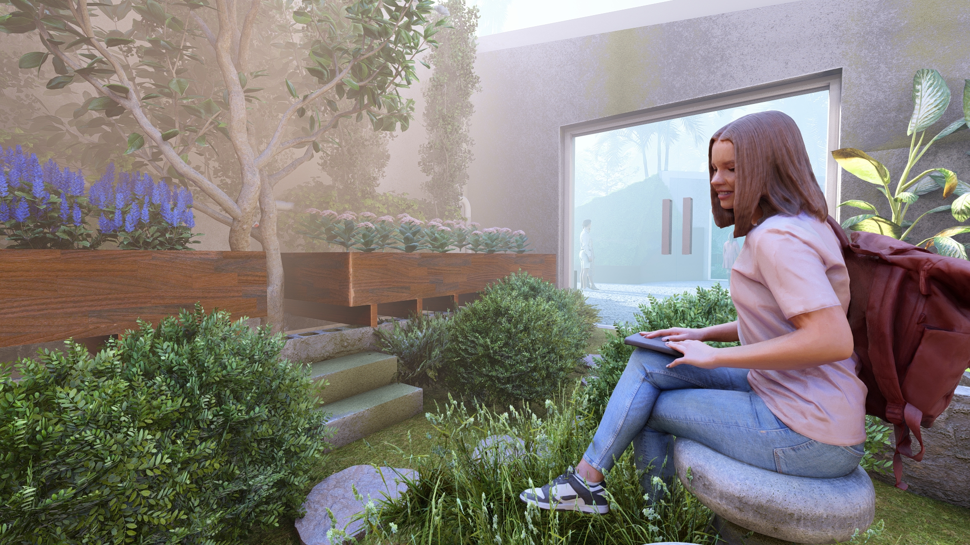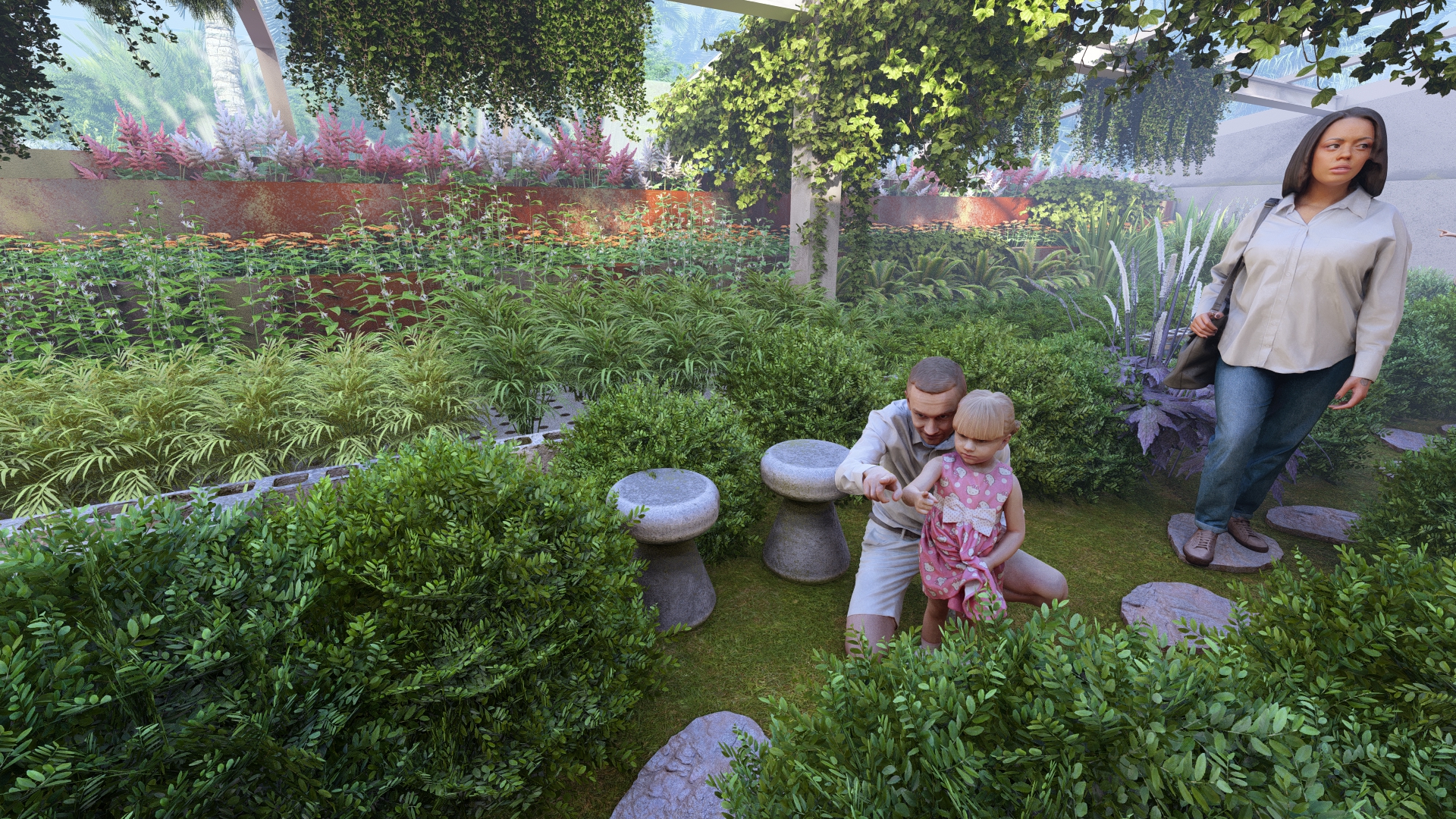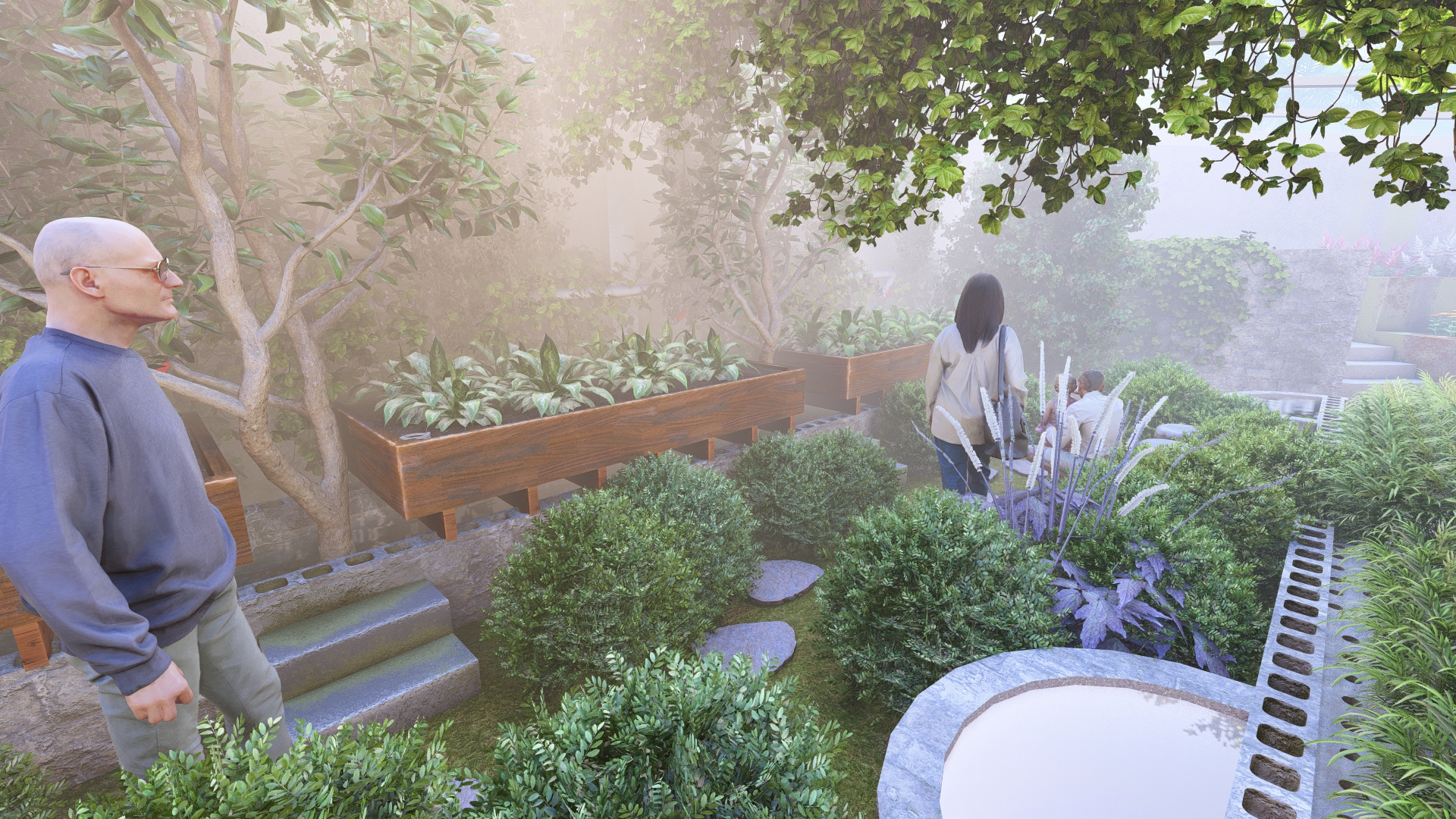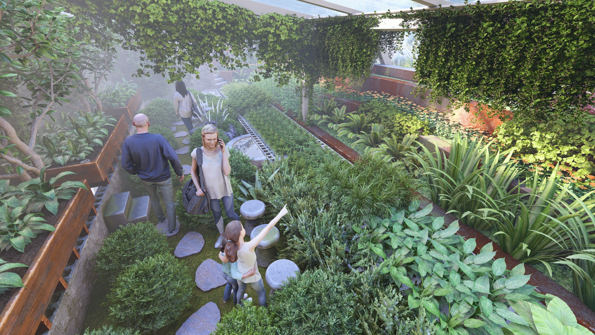 A stepping stone pathway with pebbles winds around the terrace planting area, leading visitors toward the seating zone at the end of the Aquapini structure. The path encourages exploration and interaction with the surrounding greenery.