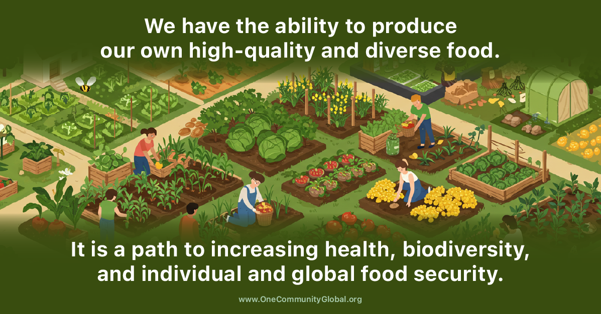 One Community wants to help people to grow their own high quality and diverse food. We believe if we can make this easy enough, affordable enough, and attractive enough, it will provide a clear path to increasing health, biodiversity, and individual and global food security. It also has the potential to revolutionize the way people look at and interact with the food they eat. As part of our self-replicating and self-sufficient teacher/demonstration communities, villages, and cities model, this could also address world hunger.