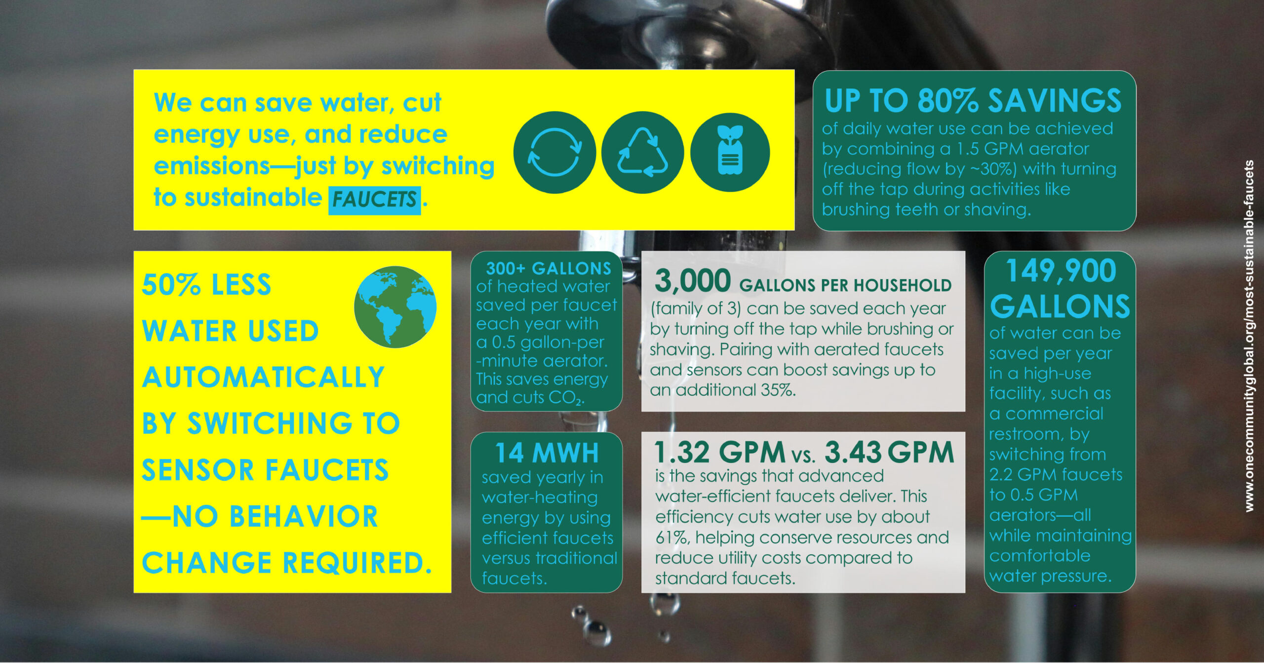 Water conservation is a foundation of One Community’s open source strategy for building a global collaboration of self-sufficient and self-sustainable teacher/demonstration communities, villages, and cities for The Highest Good of All. One of the biggest ways to conserve water is through modifications to daily habits that use a lot of water. Using water-saving faucets and/or water-saving faucet additions is one way to do this, especially in commercial environments. With this in mind, we have researched the best water-saving faucets and faucet accessories as part of our open source contribution to comprehensive sustainable living. This page is a collection of our initial research and will evolve with our experience. It contains the following sections: